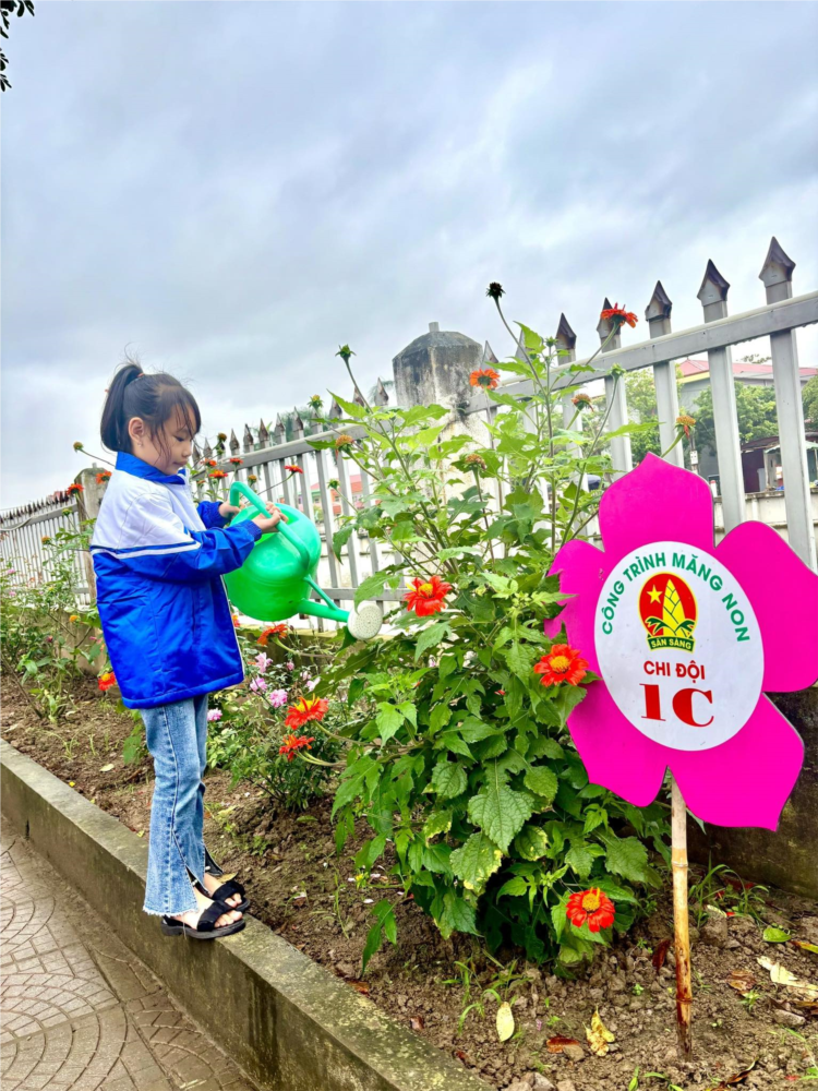 Mỗi buổi sáng đến lớp, em tưới nước cho cây, nhổ cỏ quanh gốc và nhặt rác bỏ vào thùng. Những việc làm nhỏ ấy giúp cây cối luôn xanh tốt, hoa nở rực rỡ, tạo nên không gian học tập trong lành và vui tươi. 🌼