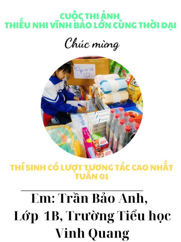 📸 Em Trần Bảo Anh, học sinh lớp 1B, Liên đội Trường Tiểu học Vinh Quang – cô bé nhỏ nhắn nhưng tràn đầy năng lượng tích cực và lòng nhân ái, đã xuất sắc giành giải thưởng “Lượt tương tác cao nhất tuần 01” của cuộc thi.