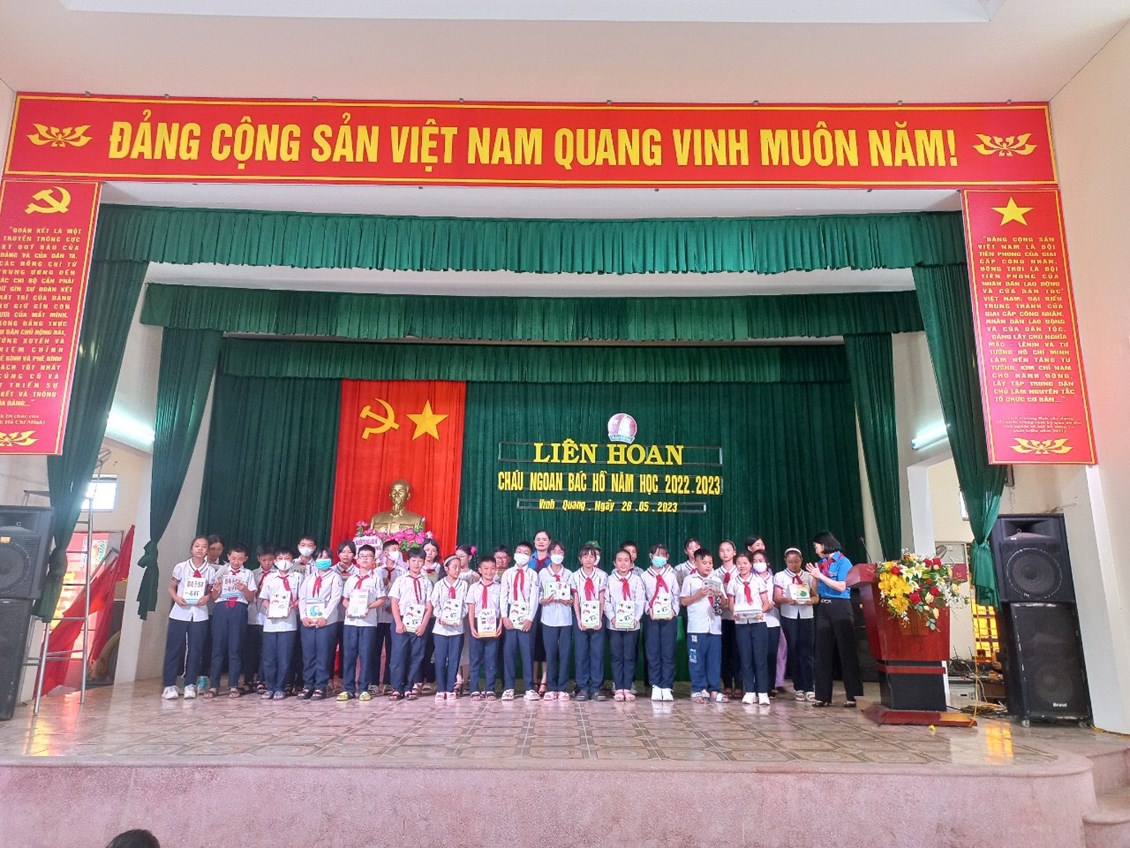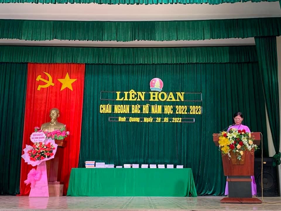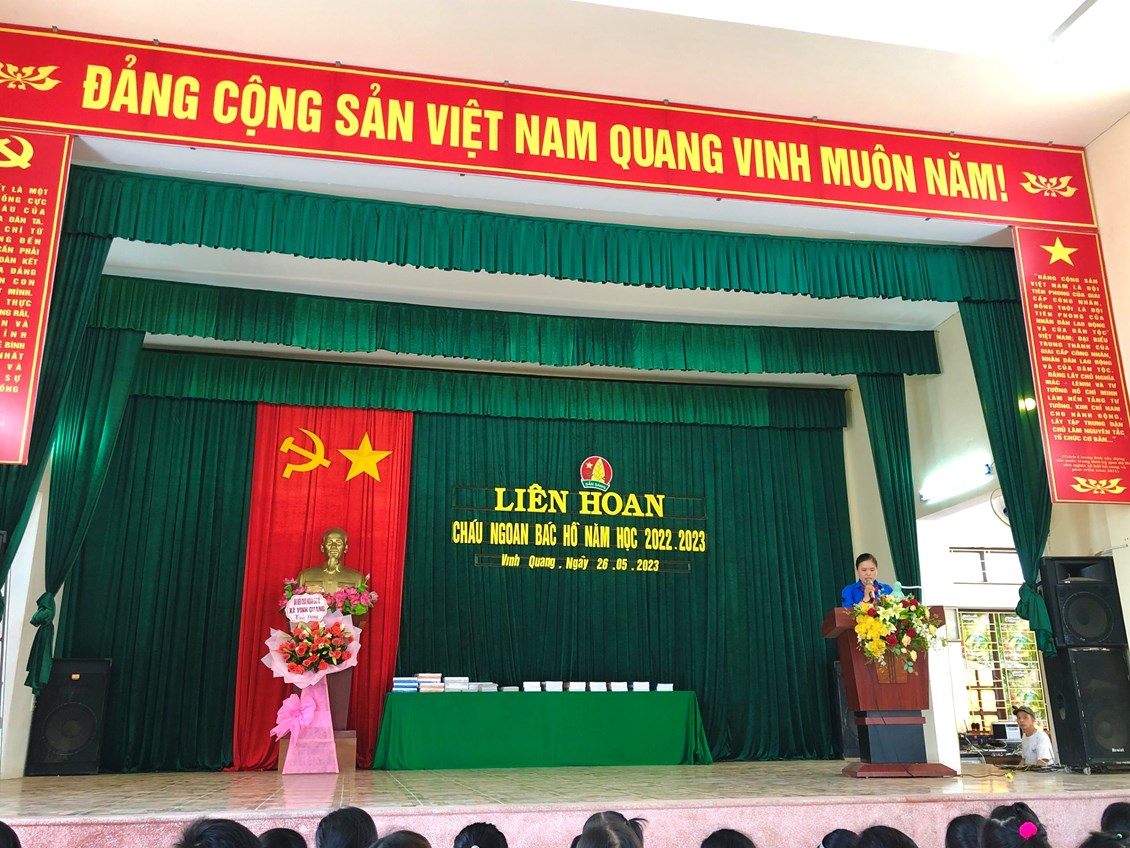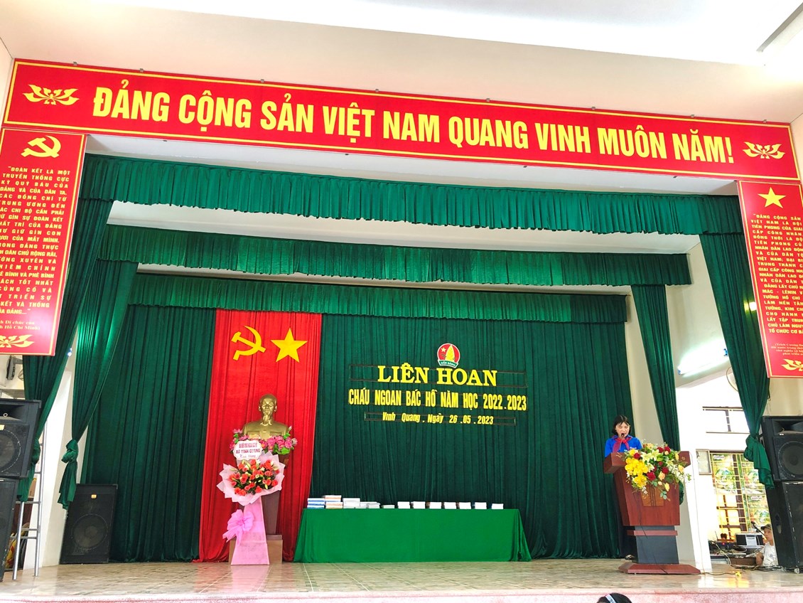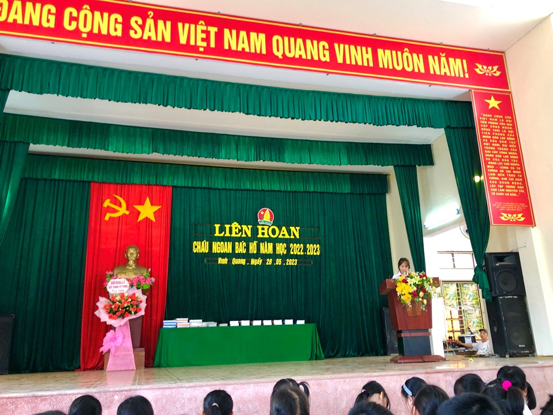 Cô giáo Trần Thanh Thuý - Tổng phụ trách Đội trường Tiểu học Vinh Quang đọc quyết định khen thưởng danh hiệu cháu ngoan Bác Hồ
