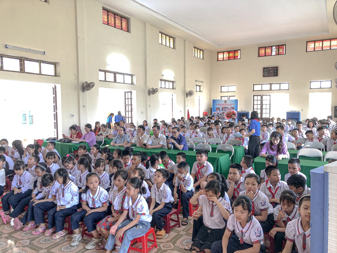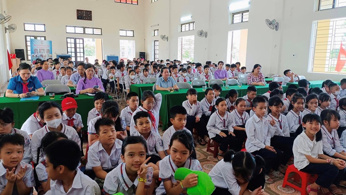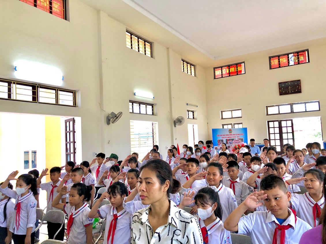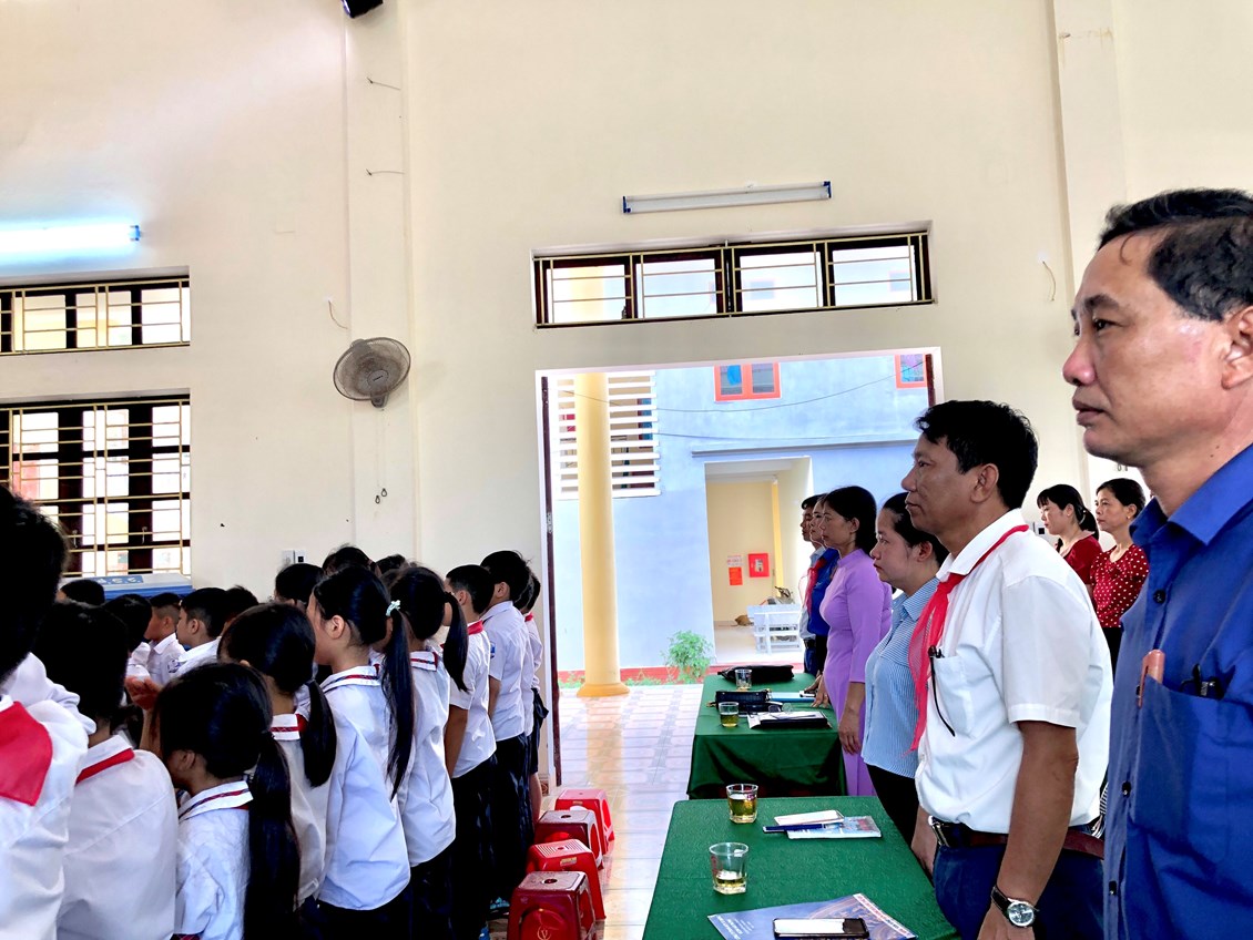 Cô giáo Trần Thanh Thuý - Tổng phụ trách Đội trường Tiểu học Vinh Quang đọc quyết định khen thưởng danh hiệu cháu ngoan Bác Hồ