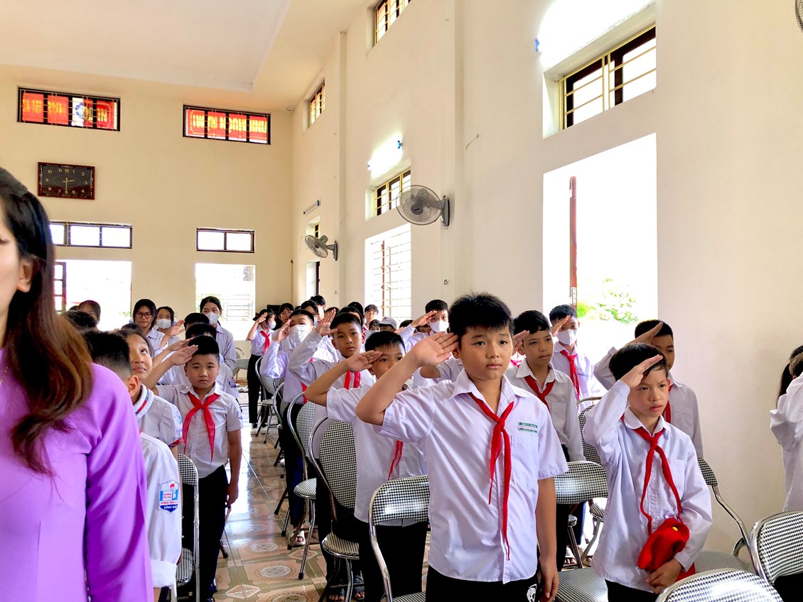 Em Nguyễn Võ Nhật Anh - học sinh lớp 8A1 trường Trung học cơ sở Vinh Quang - Thanh Lương (cơ sở 1) báo cáo kết quả hoạt động của 2 liên đội