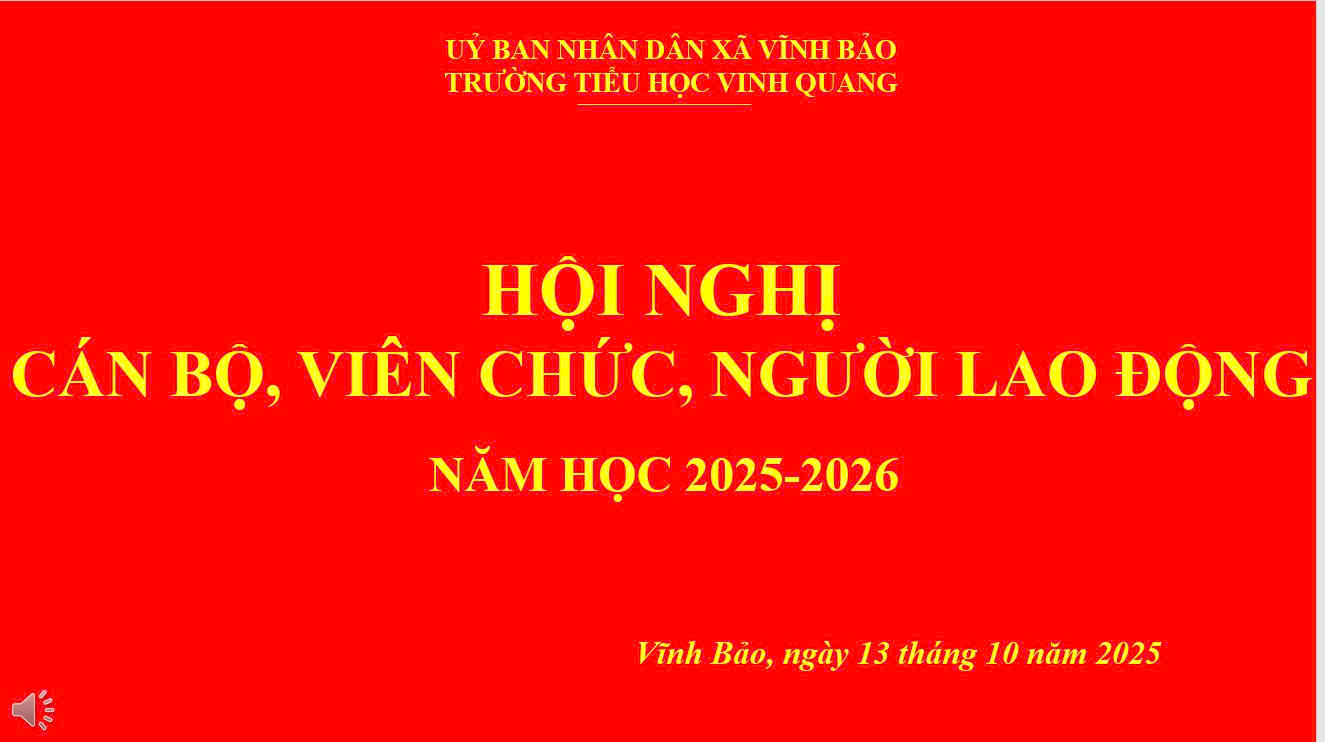 Ngày 13 tháng 10 năm 2025, Trường Tiểu học Vinh Quang (huyện Vĩnh Bảo, TP. Hải Phòng) đã long trọng tổ chức Hội nghị Cán bộ, Viên chức, Người lao động năm học 2025–2026 trong không khí dân chủ, trách nhiệm và đoàn kết. Đây là hoạt động thường niên có ý nghĩa quan trọng, nhằm phát huy quyền làm chủ, tinh thần đoàn kết, trí tuệ tập thể trong việc xây dựng và triển khai nhiệm vụ năm học mới.
